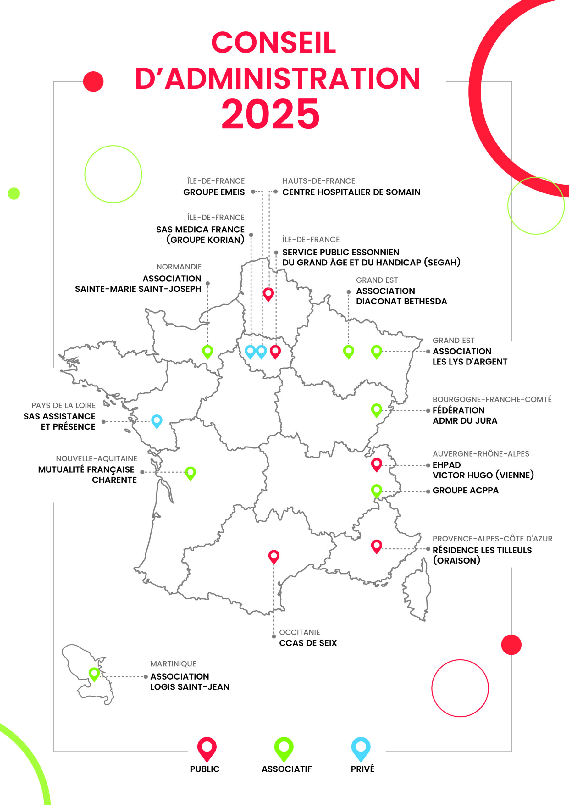 La fédération rassemble des CRT portés par des EHPAD, des SSIAD, des SAAD, ou encore des groupes, engagés dans la transformation de l’offre d’accompagnement, quel que soit le territoire ou la typologie de population concernée.
