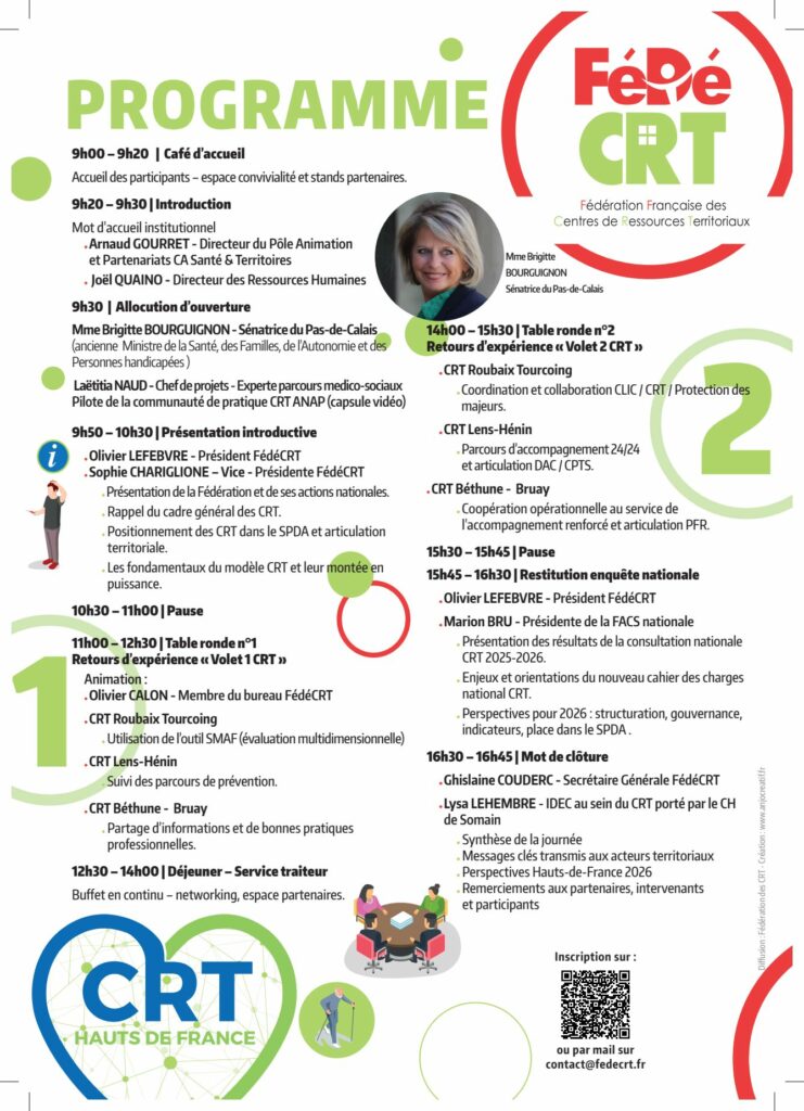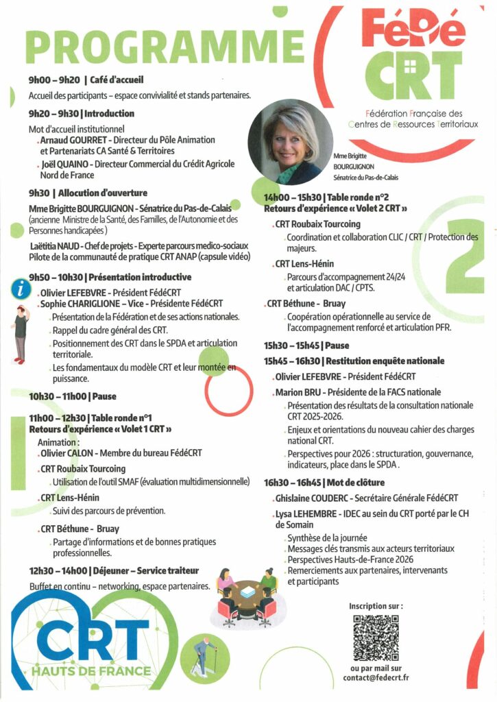La Journée régionale des Hauts-de-France s’adresse prioritairement aux CRT de la région et à leurs partenaires de proximité (DAC, CPTS, SAAD, SSIAD, PFR, établissements, collectivités…), et a été conçue comme un temps de travail partagé, au service des enjeux de prévention, de coordination des parcours et d’accompagnement renforcé à domicile.